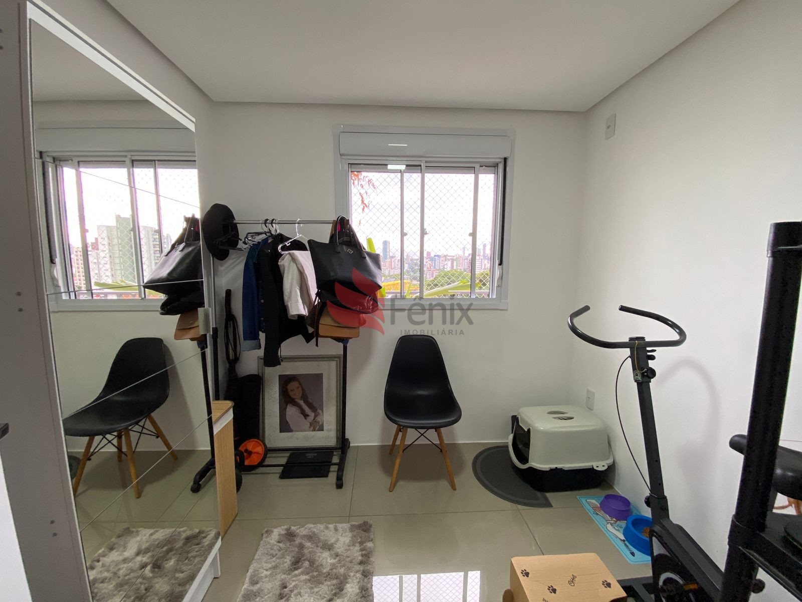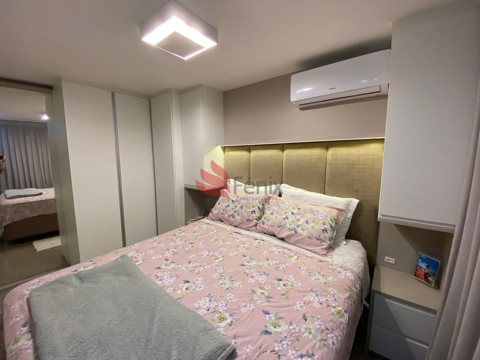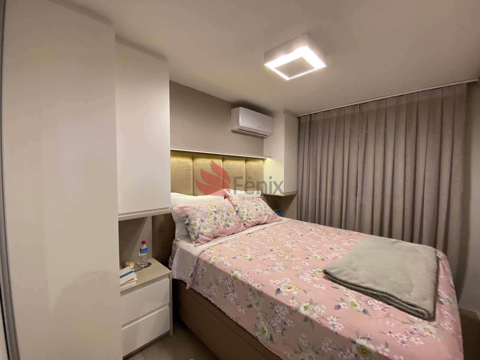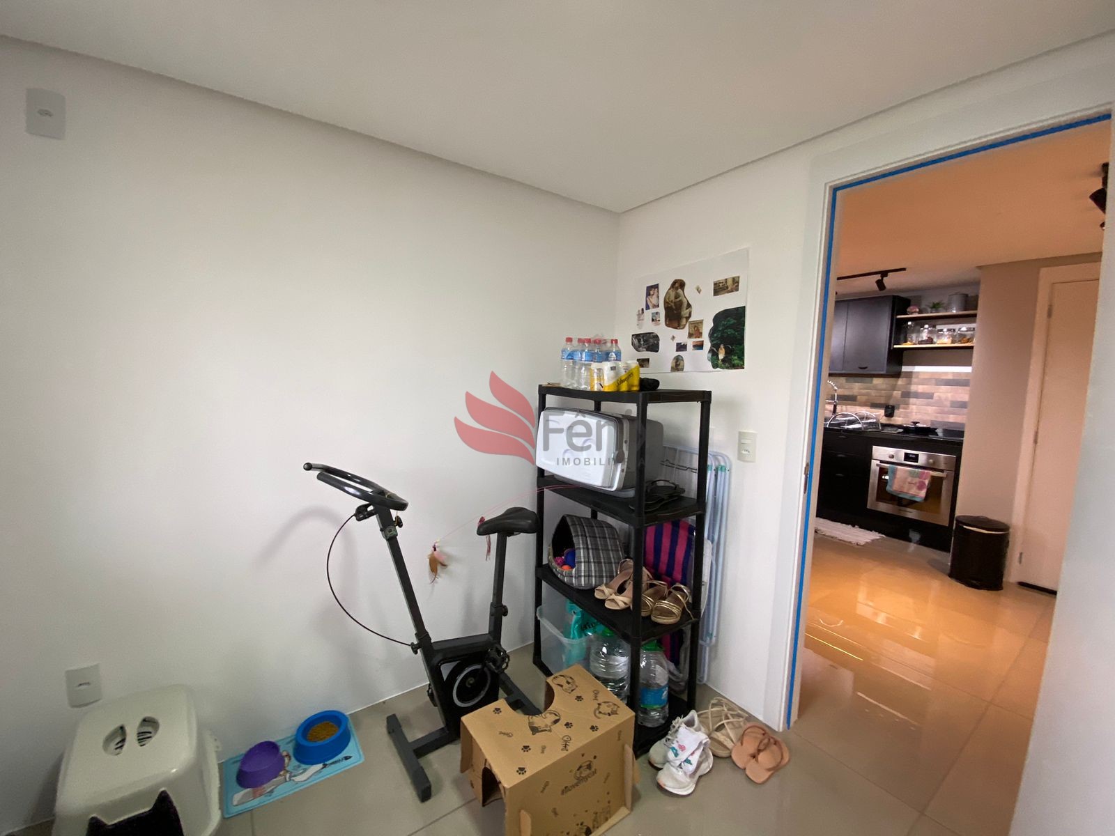 Porta fechada, ficam todos os móveis planejados, móveis e eletros. Cama com baú, fogão de indução.
